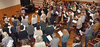 70 Männerstimmen füllten den Saal und erarbeiteten mit Referent Lukas Joham einen bunten Strauß an Melodien.