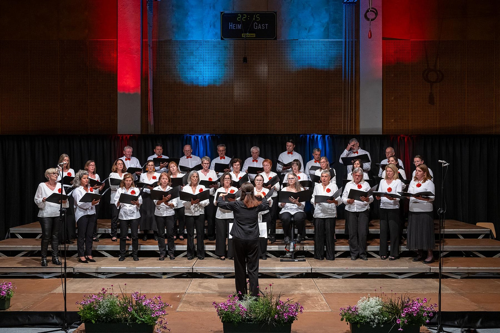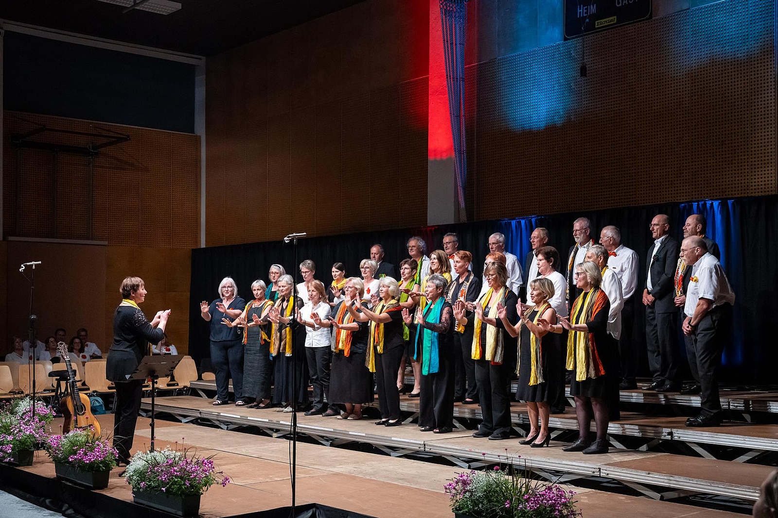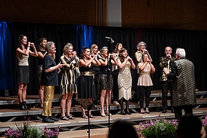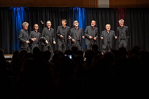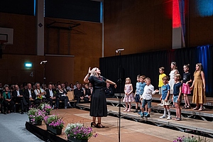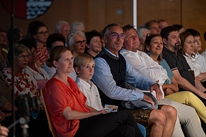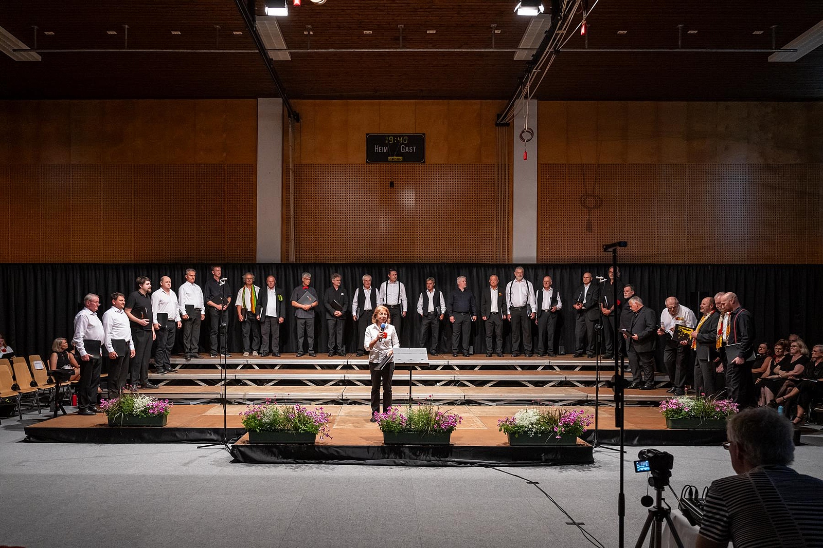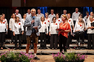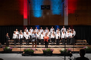 In der reich gefüllten Halle begann der Abend mit der Darstellung des ehemaligen Männerchores Concordia und dem Gesang des eigens damals komponierten Mottos. Durch den Krieg gab es leider wenig Männer und ab 1950 entschloss man sich auch Frauen im Chor aufzunehmen, woraus die heutige „Liedertafel Seekirchen“ entstand, die gleich als erstes den Reigen der darbietenden Gruppen eröffnete. Durch den Abend führte als Moderator Dominikus Forsthuber, der sehr unterhaltsam die mitwirkenden Chöre und Ensembles vorstellte und deren Stücke ankündigte. So entstand ein abwechslungsreiches und vielseitiges Programm, bei dem sich jede/r Zuschauer:in wiederfinden konnte. Man spürte die Freude an der Musik und die Hingabe, mit der die Sänger:innen dieses Fest musikalisch gestalteten.