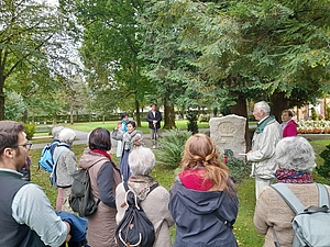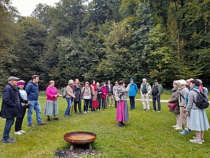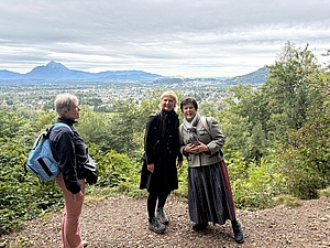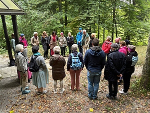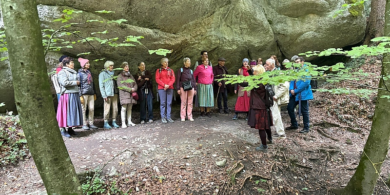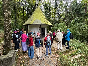 Durch den Aigner Park, am Bach entlang, führte der Weg zur Höhle – und schließlich in die Aigner Kirche. Dort wurde kurz innegehalten, ein Marienlied und ein getragener Jodler erklangen – ein stimmungsvoller Moment. Auf dem Rückweg passierte die Gruppe den Waldfriedhof Aigen. Dort zeigte der teilnehmende Albrecht Spaun, Sohn des bekannten Künstlers Friedl Spaun, den von seinem Vater eigenhändig behauenen Grabstein. Im Gedenken an ihn stimmte Albrecht den Jodler „An Berigler Franz seiner“ an, den die Gruppe gemeinsam weiter intonierte.