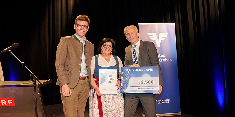 Preisträgerin Elfi Unteregger mit Volkskultur Landesrat Max Aigner und Volksbank-Vorstandsdirektor Michael Bieling. Foto Salzburger Volkskultur/Christian Haggenmüller