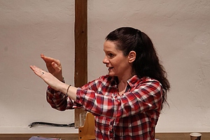 Sonja Prugger entführte die Sängerinnen und Sänger mit ihrem musikalischen Temperament und ihrer mitreißenden Energie einerseits in die Welt des durch groovige Rhythmen sowie poppige Sounds und Songs geprägten Chorgesangs. Darüber hinaus machten die Teilnehmenden in ihrem Workshop „Rhythmus im Chor“ erste Erfahrungen mit kurzen Stücken, bei denen perkussive Elemente – erzeugt durch Bodypercussion – im Mittelpunkt stehen und asynchrones, gleichzeitiges Stampfen, Klatschen und Sprechen trainiert wird.