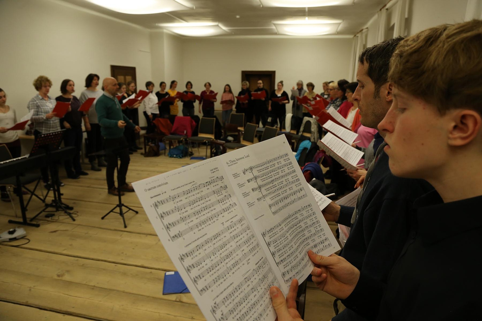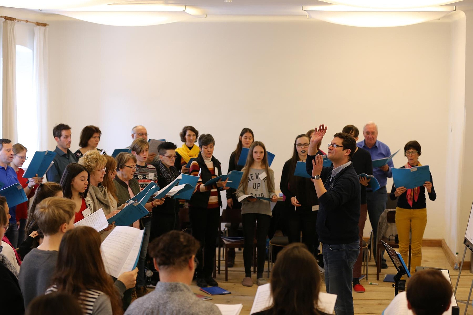 Es war eine sehr interessante Erfahrung, den Proberaum im Schloss zum ersten Mal zu betreten. Die Teilnehmergruppe war sehr vielfältig, auf mehrere unterschiedliche Weisen. Es gab Kinder, ältere Leute, Musikstudenten, Hobbysänger und Chorleiter aller möglichen Erfahrungsstufen. Alte Bekannte haben sich begrüßt, neue Teilnehmer versuchten sich einen Haufen neuer Namen zu merken. Für meinen Namen war das keine schwere Aufgabe. “Ich heiße ‘Vid’, wie ‘David’ ohne ‘Da’”, sagte ich immer.