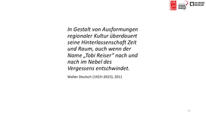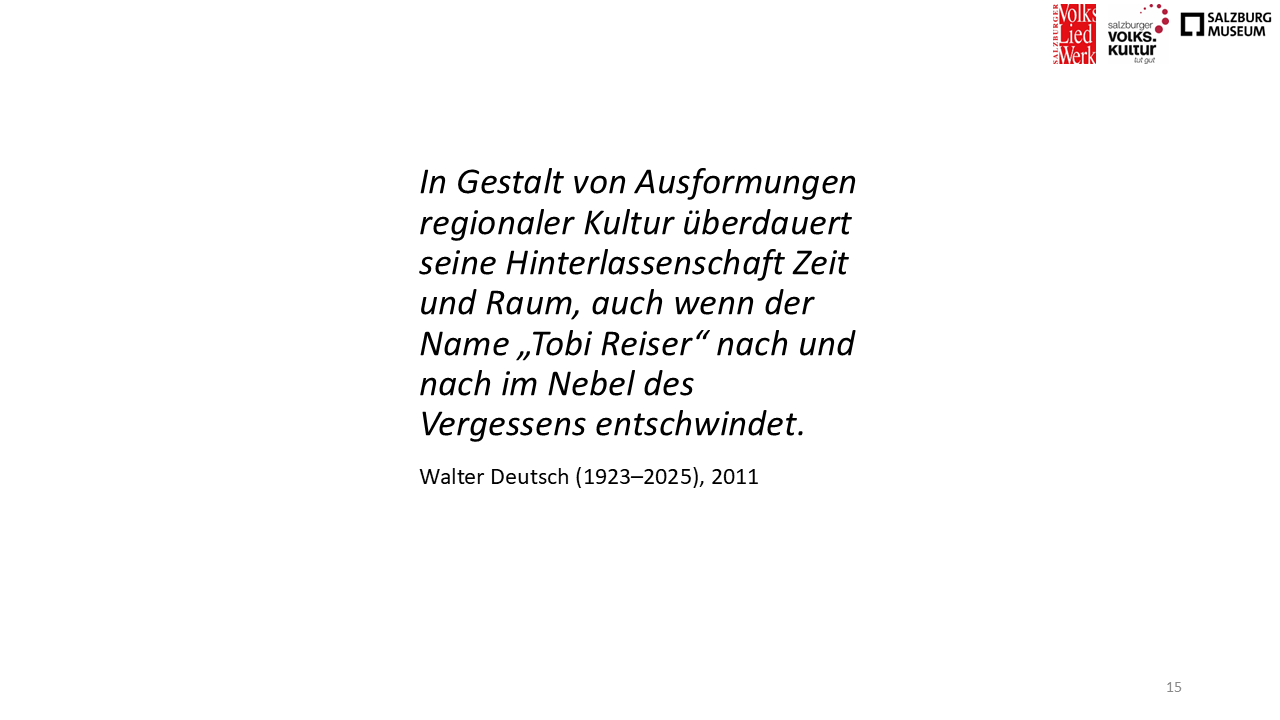Der Vortrag spannte – ausgehend von einem Zitat der Stieftochter Reisers – einen Bogen von Reisers Sozialisation in den 1930er-Jahren über seine Tätigkeiten während der NS-Zeit bis hin zu seinen volksmusikalischen Bildungs-, Vermittlungs- und Darbietungskonzepten in der Nachkriegszeit. Diese wirken, wie der 2025 verstorbene Volksmusikforscher und erste Reiser-Biograf Walter Deutsch 2011 postuliert hat, bis in die heutige Zeit hinein, "auch wenn der Name Tobi Reiser nach und nach im Nebel des Vergessens entschwindet".