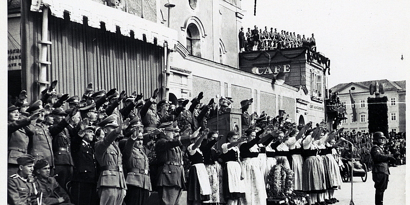 Kollektiver Hitlergruß anlässlich der Großkundgebung der NSDAP (zugleich Erntedankfeier) am Residenzplatz, 3. Oktober 1943 inklusive einer Singgruppe des Salzburger Heimatwerkes in Tracht. Bildarchiv Salzburger Volkskultur, BA-FSVK-05-09.