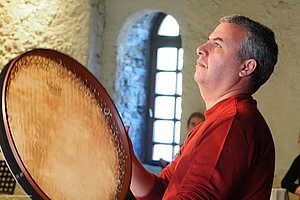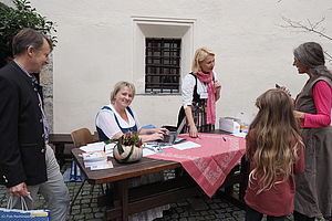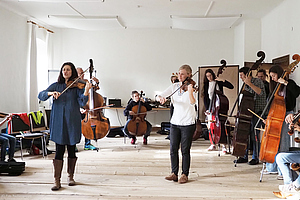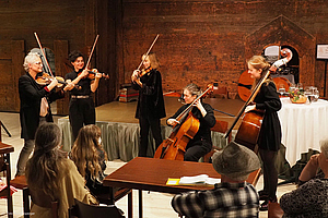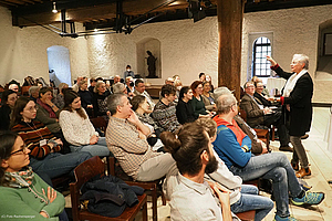 Während die Teilnehmenden der Geigen.Werkstatt am Freitagnachmittag ihre ersten Unterweisungen und Impulse erhielten, tagten die Archivleiter*innen der Österreichischen Volksliedwerke im Hofstall, um technische Neuerungen und aktualisierte Regelwerke für die Katalogisierung der musikalischen Volkskultur Österreichs ausführlich zu besprechen. Die ersten Interessierten, Tagungsgäste und potentiellen Konzertbesucher trieb es schließlich in den Schlosshof an den Empfangstisch des Salzburger Volksliedwerkes – kurze Zeit später spielten die Tanzgeiger im Kemenatensaal virtuos auf und boten einen ebenso ganzvollen wie furiosen Auftakt für die Rudi Pietsch Trilogie Der Himmel voller Geigen auf Schloss Goldegg.