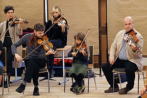 Zur sonntäglichen Matinee wurden vielerlei musikalische Kostbarkeiten geboten – Schubert-Klänge, intime Geigenjodler und bosnische Lieder bildeten den Spannungsbogen, der schließlich in die Uraufführung des von Matteo Haitzmann komponierten und der ehemaligen Salzburger Volksliedwerksvorsitzenden Roswitha Meikl (1954–2021) gewidmeten Stücks Rota mündete.