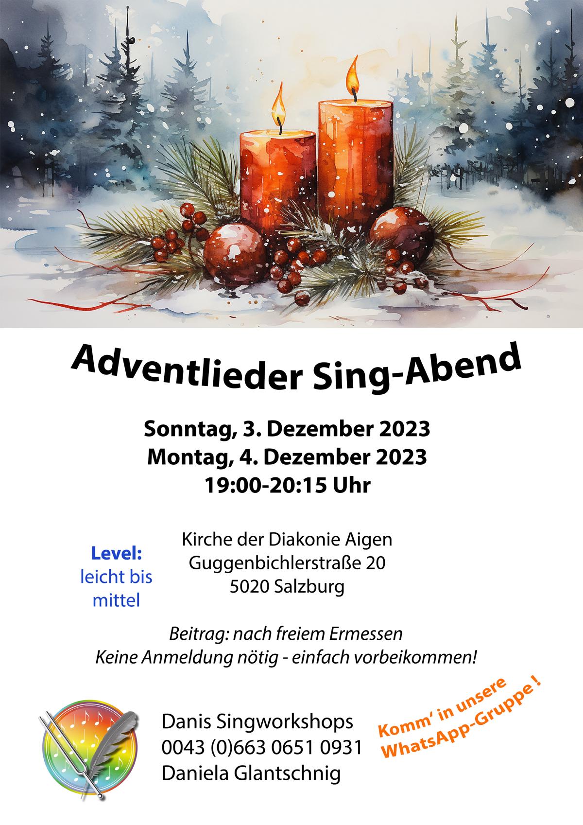 Schaut bei Interesse einfach vorbei, es ist keine Voranmeldung nötig. Ich sammle keine Namen ein und versende auch keine Newsletter. Das Singen ist wirklich völlig frei besuchbar. Wer mag, wird gern in die WhatsApp-Gruppe (+43 (0)663 0651 0931) aufgenommen, kann dort Liedwünsche äußern und erhält zeitnah die nächsten Termine. Außerdem werden ausgewählte Lieder aufgenommen und die Audios nach dem Singen in die Gruppe gestellt.