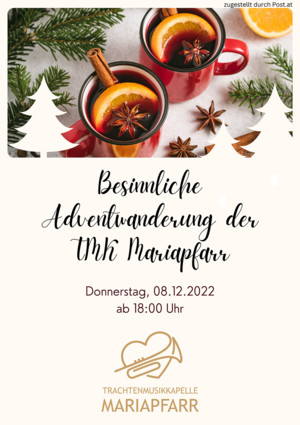 Die TMK Mariapfarr veranstaltet am 8.Dez. eine besinnliche Adventwanderung. Strecke ca. 1.5 km, Musik, Lieder, Hirtenspiel, Geschenk für jedes Kind, gratis Fackeln, Speisen und Getränke