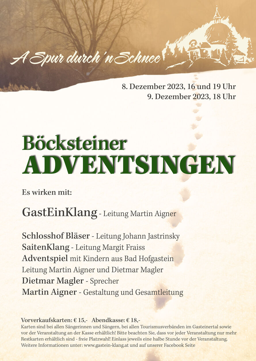 Es bleibt zu wünschen und hoffen, dass der Titel des diesjährigen Adventsingens „A Spur durch´n Schnee“ tatsächlich Programm sein wird und sich die bezaubernde Landschaft rund um das malerische Böcksteiner Kirchlein in sanftem Weiß präsentiert. Ein inniger Wunsch aller aufführenden Gruppen ist es weiters, alle Schwierigkeiten der heutigen Zeit in dieser feierlichen Stunde auszublenden und dass sich alle im Gotteshaus versammelten Menschen mit den einfühlsamen Darbietungen wunderbar auf das nahe Weihnachtsfest einstimmen können.