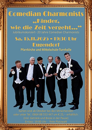 Ihr 20-jähriges Jubiläum begehen die 6 Herren der Comedian Charmonists mit einem 2-teiligen Konzert an zwei verschiedenen Aufführungsorten. Einerseits in der Pfarrkirche Eugendorf – andererseits im Turnsaal der MMS. Dies ist den verschiedenen Stilrichtungen dieses „Best of“ Konzertes geschuldet und ermöglicht eine musikalische Reise, die für jeden etwas zu bieten haben sollte. Ein muss ich gehört haben für alle FreundInnen des vielschichtigen Männergesangs.