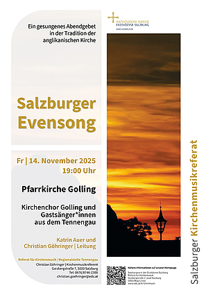 Herzliche Einladung im Namen des Kirchenchor Golling unter der Leitung von Katrin Auer zum Salzburger Evensong in der Pfarrkirche Golling.