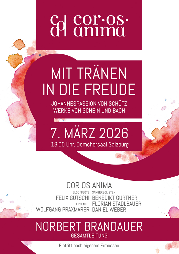 Gemeinsam mit den jungen Salzburger Solisten Benedikt Gurtner, Florian Stadlbauer und Daniel Weber werden zudem Werke von J. S. Bach und Schein musiziert. Der Salzburger Blockflötist Felix Gutschi, der sowohl in der frühen wie auch in der zeitgenössischen Musik zu Hause ist, führt virtuos delikat durch das Programm. Der CorOsAnima unter der Leitung von Norbert Brandauer möchte Sie mit Musik berühren und Ihnen Gelegenheit geben, etwas zur Ruhe zu kommen und eine neue Form von Freude zu hören. Herzliche Einladung!
